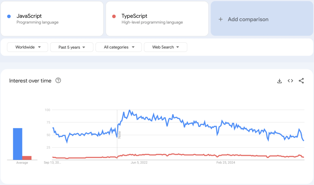 Let’s look at Google Trends for the past 5 years. Unsurprisingly, JavaScript is 3–4 times more in demand than TypeScript. But here’s the catch: TypeScript’s line on the chart is steady, no spikes, no collapses.