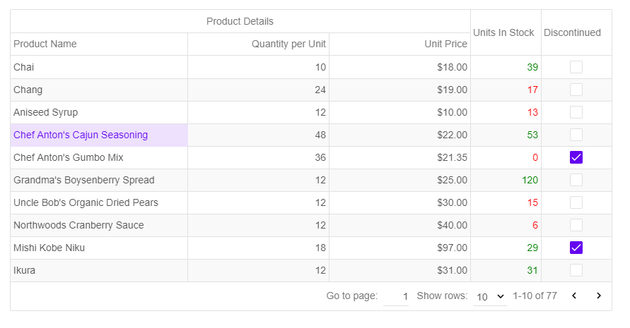 - Automatically configured columns based on the data passed to the Grid